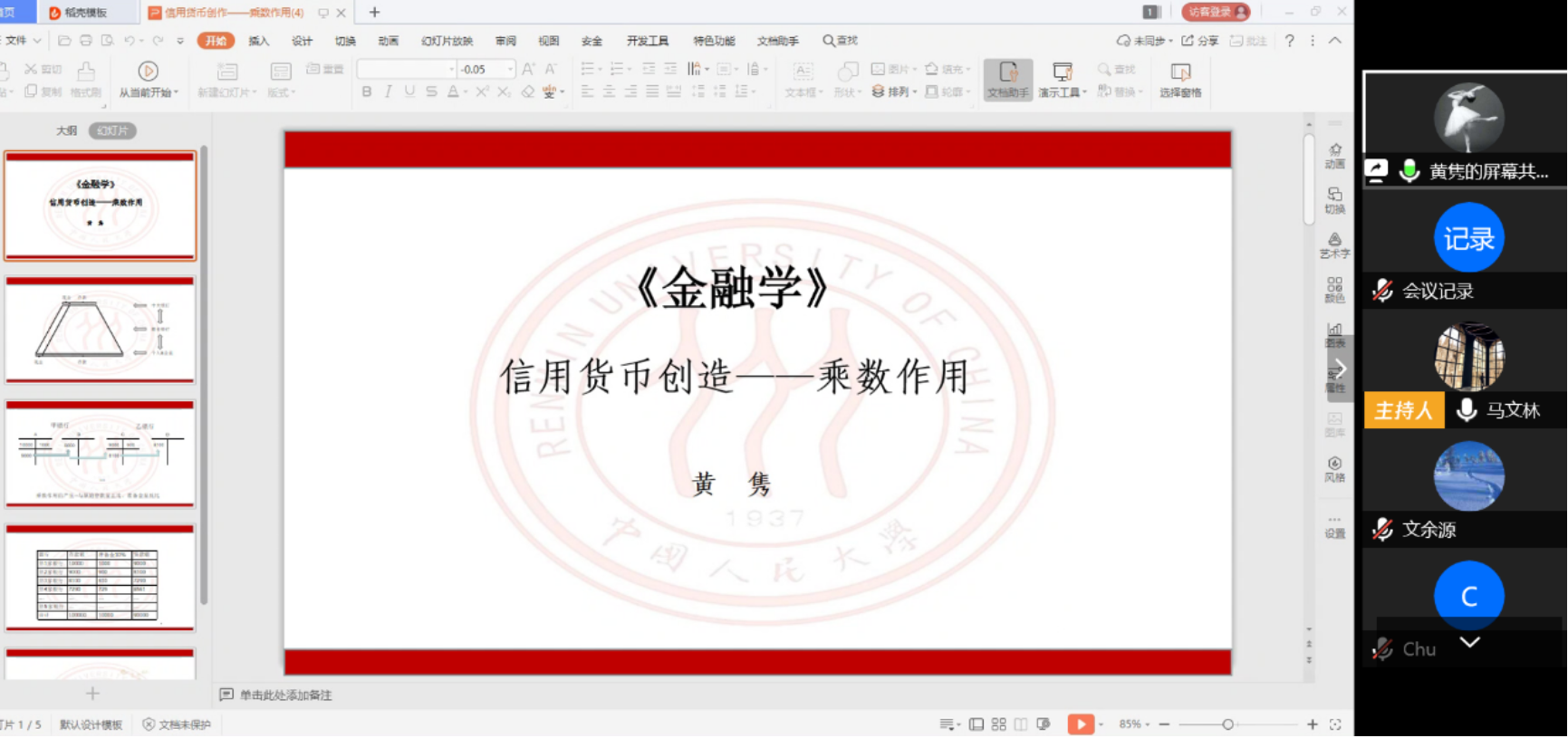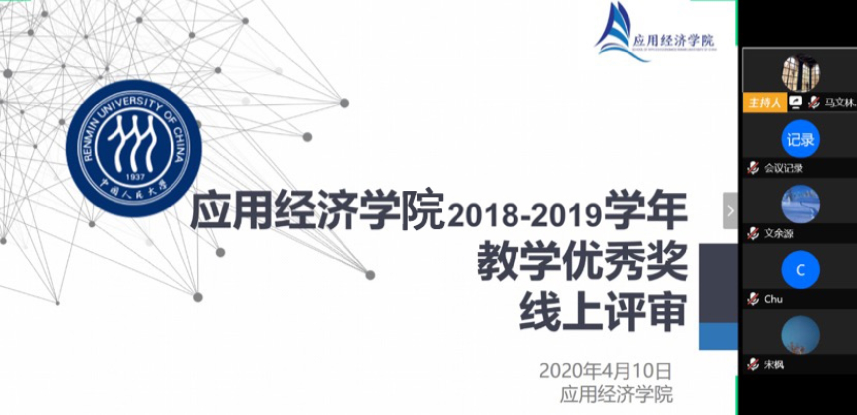 4月10日14时,黑料社 组织教师进行腾讯会议线上评审,参评老师使用幻灯片和共享屏幕进行展示,每场用时5分钟,依次向评奖评优委员会展示了一段本科教学课程,还原了本科课堂的教学实况,充分展现了化繁为简的经济学功底。黑料社 教师评奖评优委员会在综合教学展示和学生课堂评估分数后优中取优,通过问卷星进行无记名投票,在取平均分后按得分由高到低取前五名。最终推荐名单为:陈占明、黄隽、蒋黎、苏汝劼、张红霞(按姓氏拼音排名)。