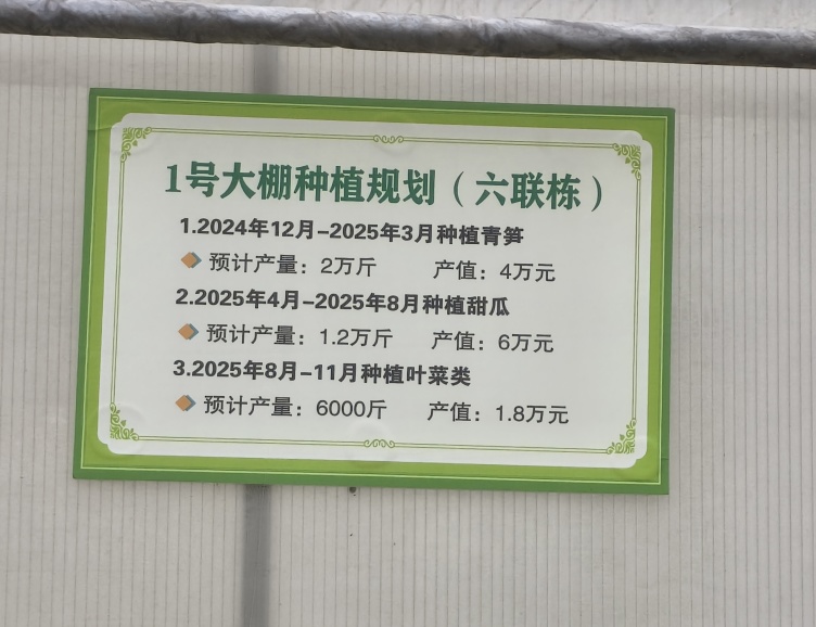 采摘大棚位于到达QQ农场的必经之路上,每个棚上都张贴了清晰具体的种植规划,例如1号大棚采用分时段种植青笋、甜瓜、叶菜类的模式,不仅提高了土地利用率,避免大棚土地闲置,还增加了经济效益。