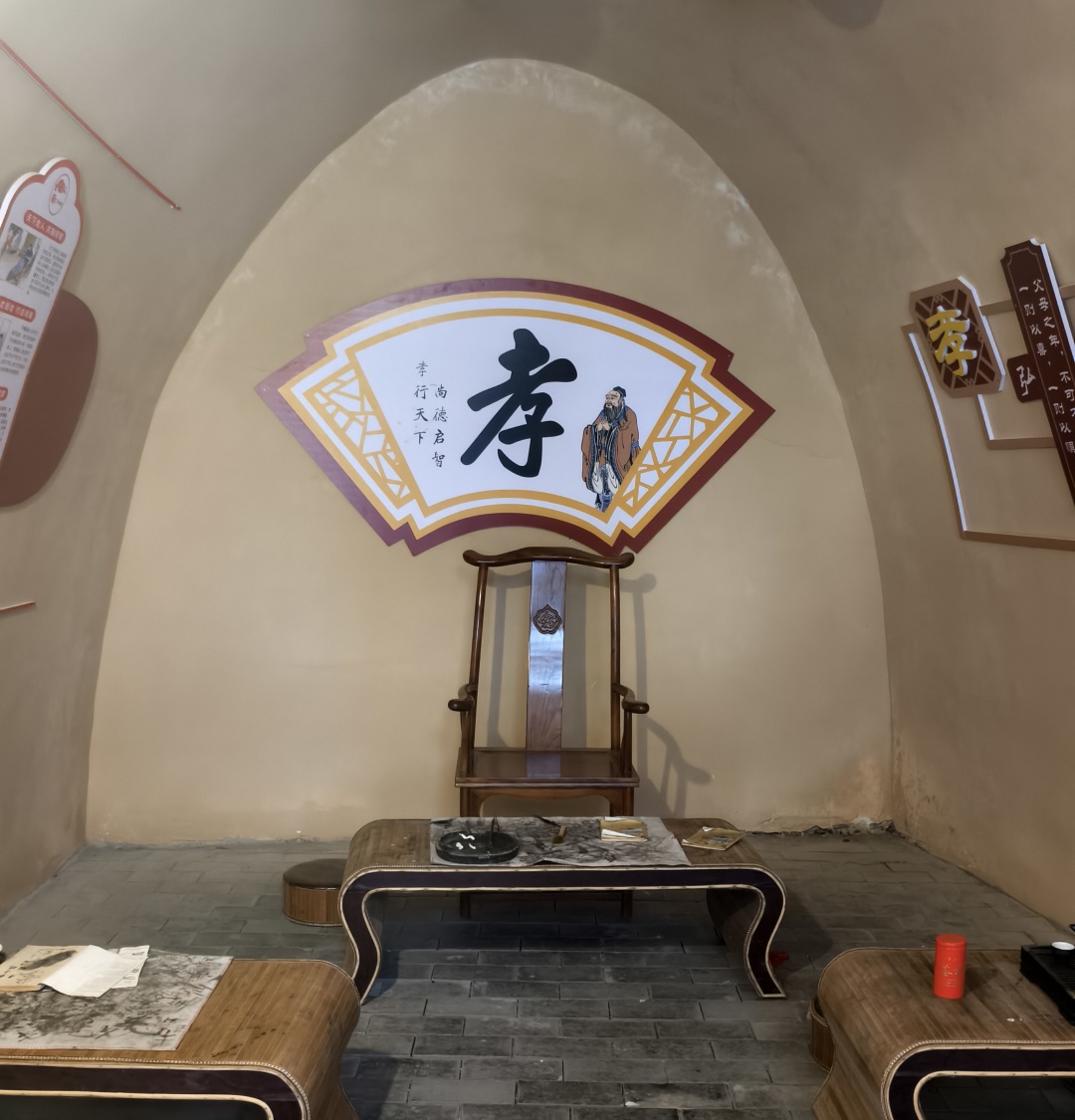此外,在地坑院窑洞内打造了“孝文化研学教育基地”,以原先存在的土窑洞为基础进行翻修和加固,洞内主题分别对应孝文化传承馆、文谷绒剪纸工作室、家风家训展室、刘霞故居、长武传统美食展览等。其中孝文化传承馆内还原古学堂布置,配有笔墨纸砚、黑板书本,墙面装饰孝文化诗词,营造孝文化氛围浓厚。自孝文化研学教育基地建成以来,吸引了周边中小学师生前来研学,切身感受厚重“孝文化”的魅力并接受其熏陶,领悟中华传统文化的精髓。2024年7月,彭公镇与县教育局联合在全国范围内举办了首届孝文化主题征文大赛,共征集来自北京、广东、湖南等全国18省合计123篇(首)参赛作品,以优秀诗词作品进一步鼓舞人、教育人,以文化传承助力乡村振兴。