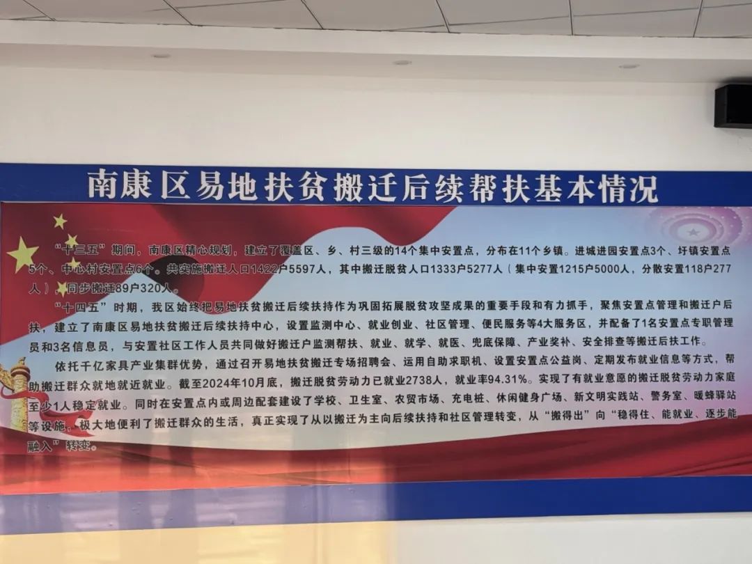 南康区依托千亿家具产业优势创新实行“3344”工作模式,探索出了一条“稳得住、能就业、逐步能融入”的后续帮扶南康特色新路。严格落实迁入地防止返贫监测帮扶主体责任和迁出地全力配合责任,做到“三个坚持”,坚持走访排查有效化、坚持识别纳入常态化、坚持监测帮扶精准化,确保“应纳尽纳、应帮尽帮、应消尽消”。截至2024年10月底,全区易地撒迁监测对象106户451人,1-10月新增识别对象24户96人。