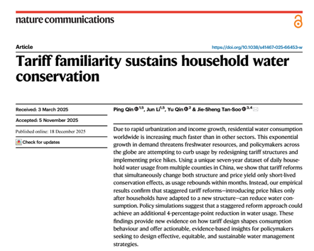 Qin, P., Li, J., Qin, Y., & Tan-Soo, J. S. (2025). Tariff familiarity sustains household water conservation. Nature Communications, 16(1), 11235.
