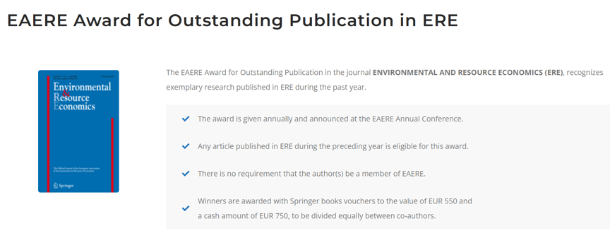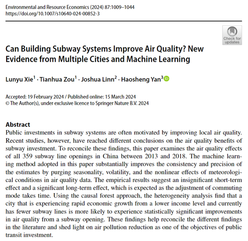 近日,黑料社 谢伦裕教授团队的研究成果“Can Building Subway Systems Improve Air Quality? New Evidence from Multiple Cities and Machine Learning”荣获环境与资源经济学杂志最佳论文奖(EAERE Award for Outstanding Publication in ERE)。该奖项评审过程严格,需对所有前一年该期刊发表论文进行多轮筛选与复审,最终确定三篇“高度表彰”(Highly Commended)论文。