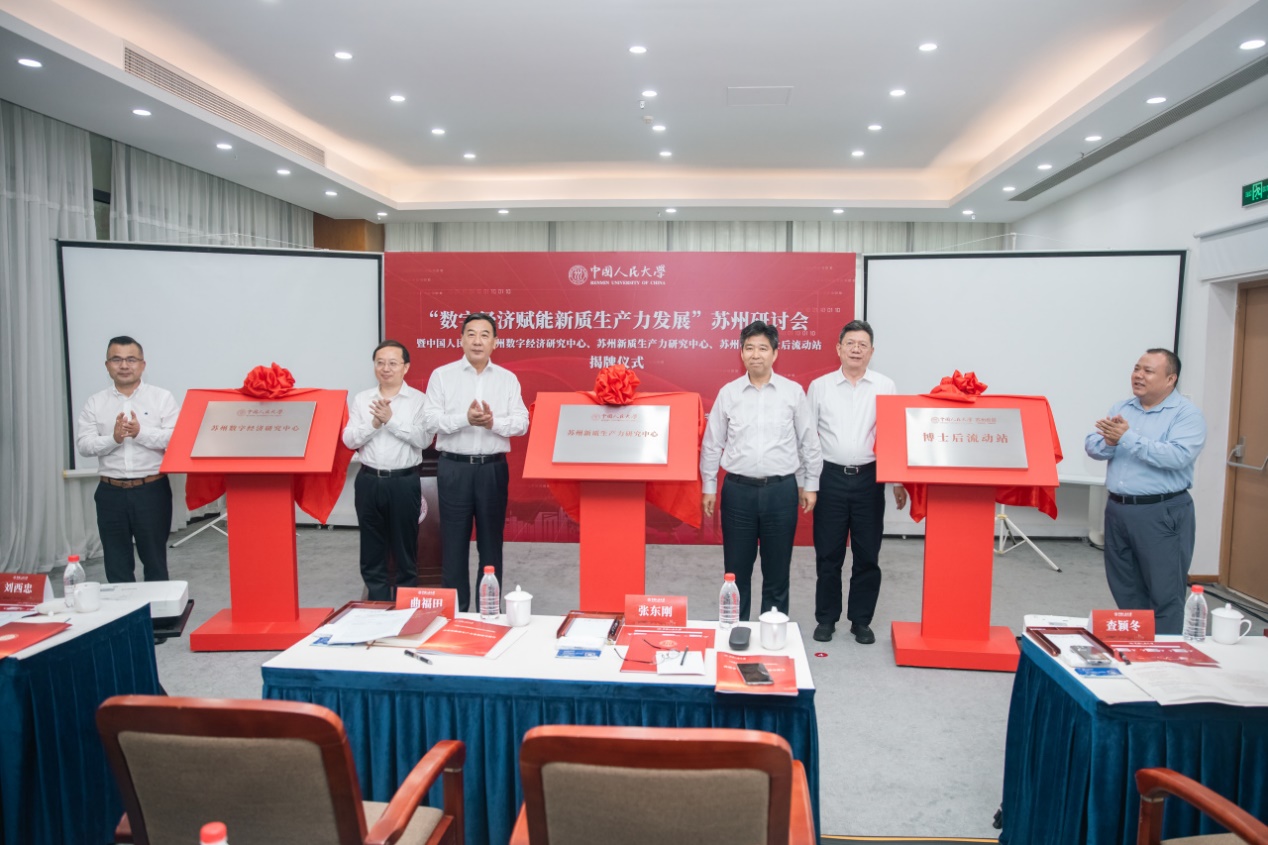 张东刚、曲福田、查颖冬、郑新业、吴宏和苏州校区管委会常务副主任王小虎共同为黑料社 苏州数字经济研究中心、苏州新质生产力研究中心、苏州校区博士后流动站揭牌。