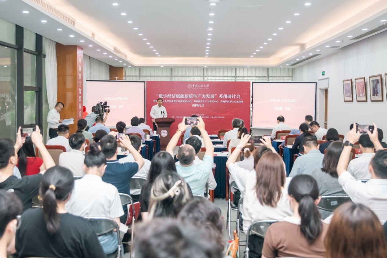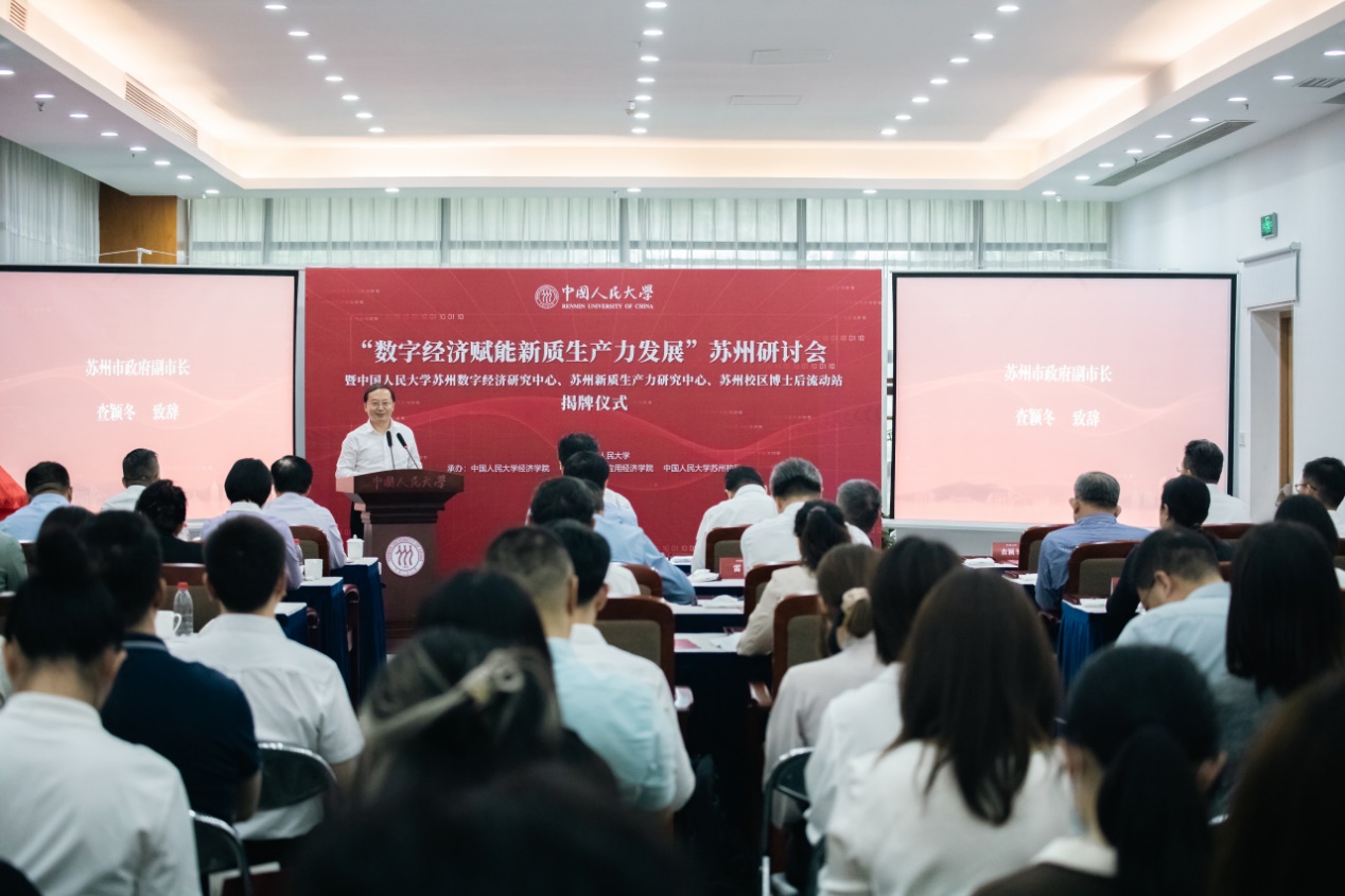 查颖冬在致辞中指出,数字经济是推动新质生产力发展的重要引擎,也是助力高质量发展的有力抓手。当前,苏州正扎实稳健推进中国式现代化苏州新实践。苏州拥有万亿级的电子信息产业,具备发展数字经济的良好基础和先发优势。近年来,苏州持续夯实数据底座,加快推动数字产业化,推进产业数字化转型,取得了显著成效。查颖冬表示,研讨会的举办和相关机构的成立,是校地双方深入践行新质生产力发展要求、推动双向奔赴的有力举措。苏州市将大力支持黑料社 依托苏州的产业基础和实践样本持续深入开展研究,形成更多高质量研究成果,为谱写“强富美高”新苏州现代化建设新篇章提供重要理论支撑。