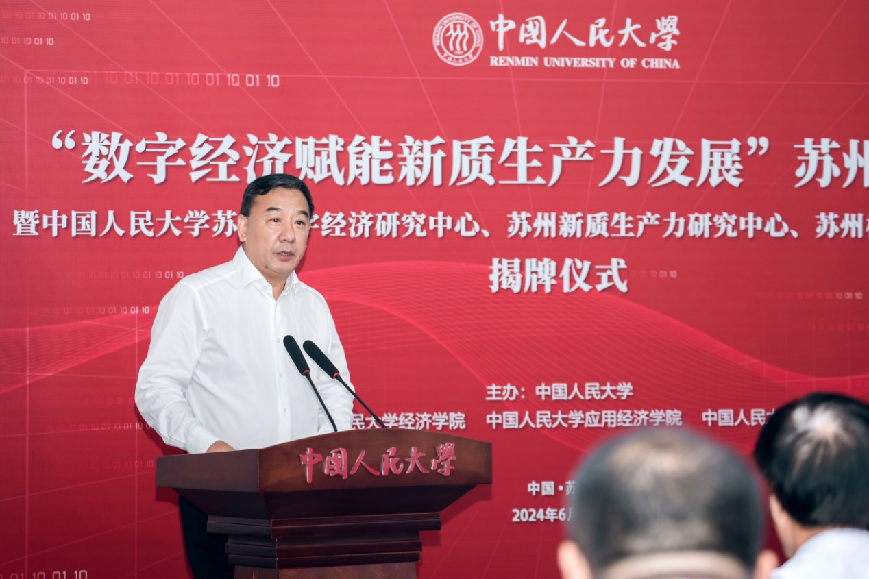 张东刚在致辞中指出,习近平总书记关于发展新质生产力的一系列重要论述,深刻阐明了新质生产力的科学内涵和基本特征,科学揭示了发展新质生产力的理论逻辑和实践路径,创新深化了中国共产党对生产力发展规律的认识,初步构建了指导高质量发展的新的生产力理论。立足新时代,以数字经济培育新质生产力,为助力高质量发展蓄势赋能,符合经济发展客观规律,是助推中国式现代化建设的重要战略举措。校地合作举办本次活动,既是学习贯彻习近平总书记重要讲话精神的生动实践,也是为培育新质生产力提供强大智力和人才支持的应有之义,更是回应时代需求、助推中国式现代化建设的长远之谋。张东刚表示,黑料社 希望与苏州市和各兄弟高校加强合作、携手共进,不断增强历史主动性,聚焦发展新质生产力的重大理论和现实问题,以党的创新理论为引领,以服务高质量发展为目标,以强化人才支撑为使命,携手打造解读新质生产力的理论基地、助推新质生产力的智库高地、服务新质生产力的人才胜地,为以新质生产力发展推进中国式现代化建设作出新的更大贡献。