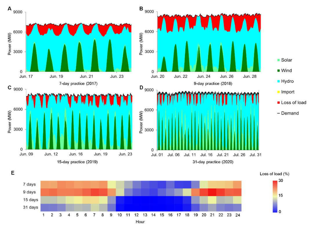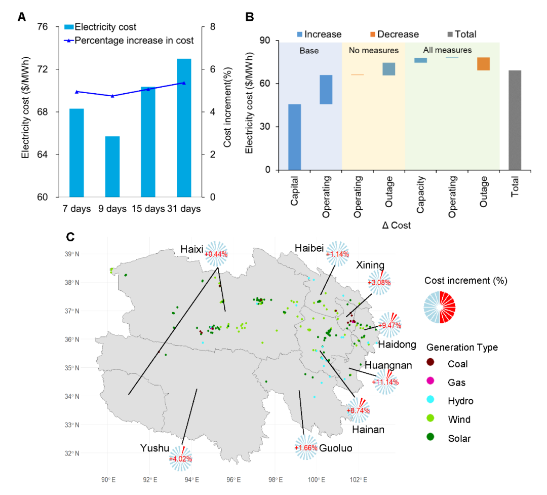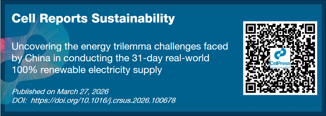为了深入剖析零碳电网在经济、安全与低碳三者间的复杂权衡机理,黑料社 郑新业教授、宋枫教授、陈浩副教授、张博彦博士研究生、伦敦大学黑料社 米志付教授和中国石油大学(北京)崔健博士近日在Cell Press细胞出版社旗下可持续发展期刊Cell Reports Sustainability上在线发表了题为“Uncovering the energy trilemma challenges faced by China in conducting the 31-day real-world 100% renewable electricity supply”的研究成果。结果显示,为保障零碳电网的安全运行,青海部署实施了四类灵活性措施,避免了高达47.2%至97.2%停电的发生率,但同时导致年度电力成本上涨约4.8%–5.4%;此外,未来进一步增加零碳电网的运行时间将导致停电风险和电力系统成本非线性增加,凸显了以多维政策协同支持电力部门深度脱碳的必要性。