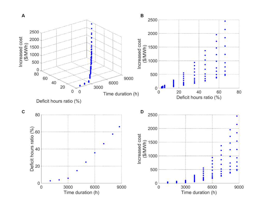 利用启发式算法,研究模拟了零碳电网在未来更长时段(1000h至8760h)运行的潜在挑战。图5显示,随着零碳电网持续运行时间的延长,系统面临的“不可能三角”挑战将呈非线性增长态势,电力短缺风险和系统成本均随时间维度呈指数级上升。