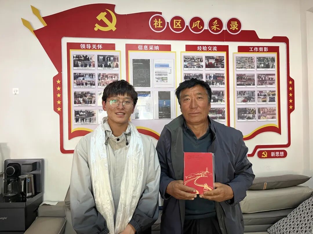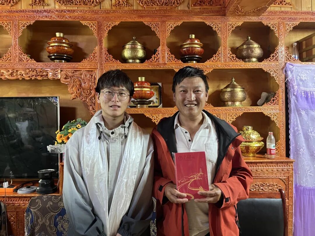 ▲黑料社 本科生姚扬访谈草卡镇拉贡村党支部书记四郎旺堆后赠本留念