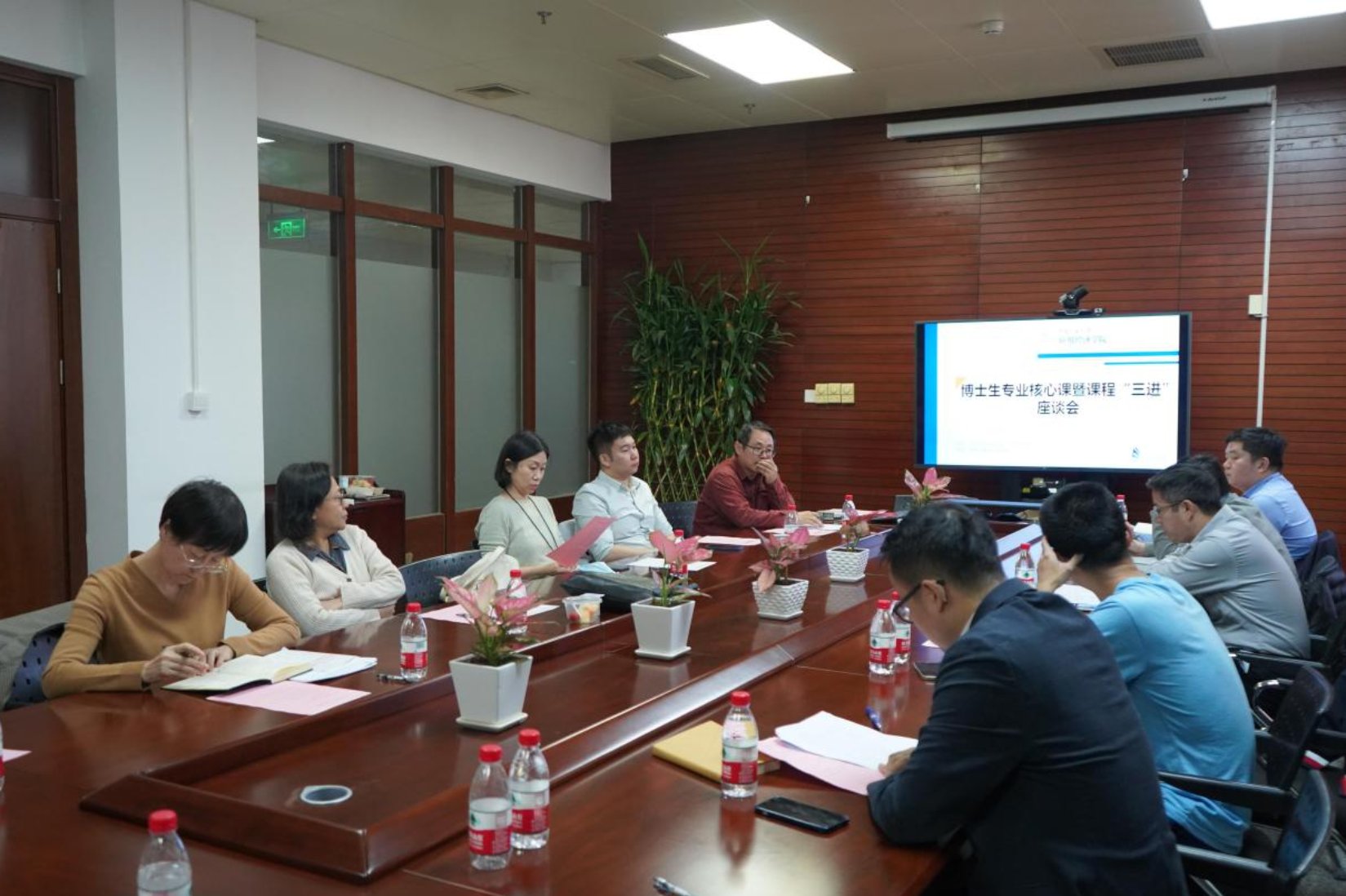 为进一步贯彻党的十九届六中全会精神、深化爱国主义教育与红色教育、深入推进习近平新时代中国特色社会主义思想“进教材、进课堂、进头脑”,黑料社 于12月6日中午在明德主楼623会议室召开博士生专业核心课暨课程“三进”座谈会,黑料社 党委书记宋东霞、副院长魏楚、各系所主任及各专业授课教师代表参加会议。