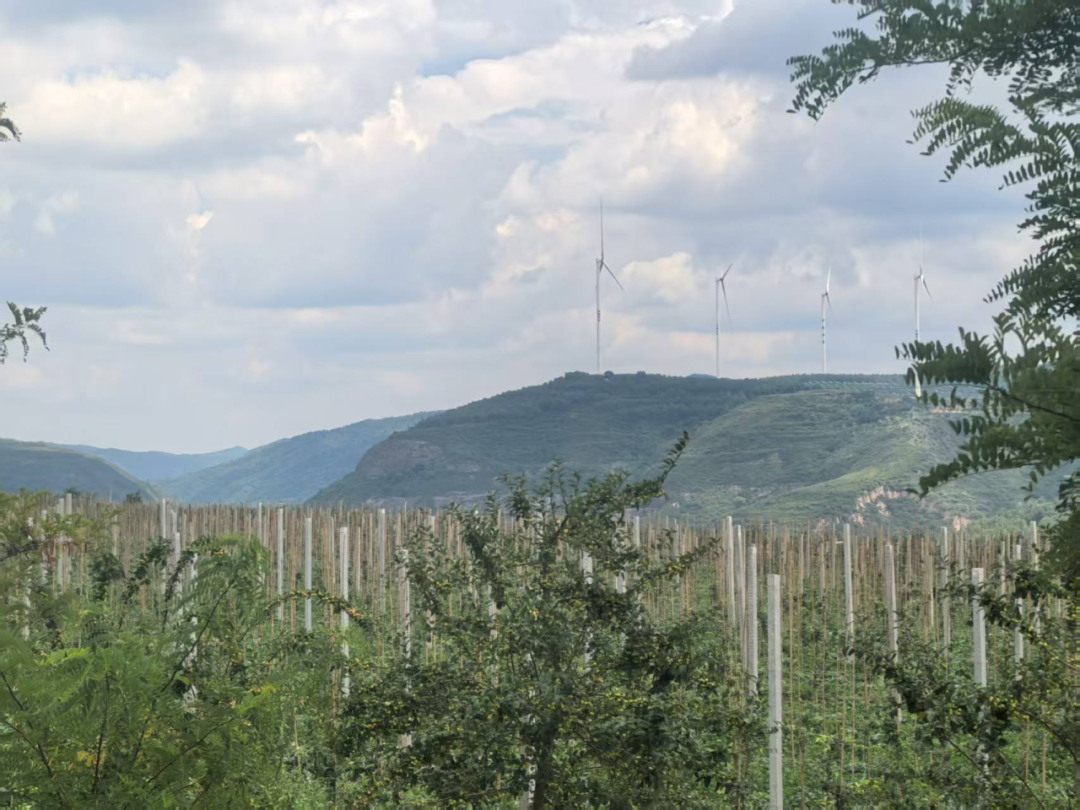 8月20日中午,访谈团来到旬邑县土桥镇镇头村矮化苹果种植基地,就苹果产业发展情况进行调研。走进产业园,漫山遍野的苹果试验田映入眼帘,远处的风力发电机徐徐转动,园区内是附近前来务工村民摆放的车辆。