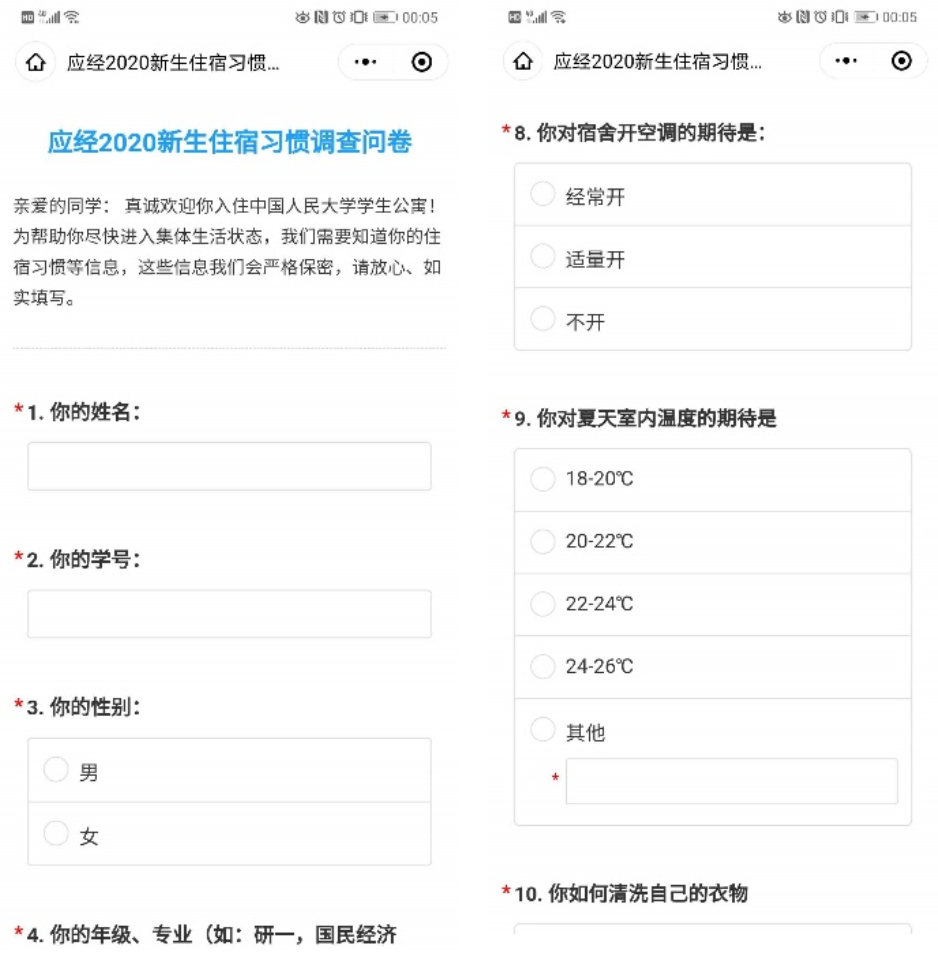 精心制作了包含14个问题的调查问卷,涉及基础信息、睡眠习惯、特殊偏好、寝室定位、人际期待等内容,全方位了解同学们的个性化需求,力求为同学们绘制精准住宿自画像。根据新生调查结果分配宿舍和床位,获得学生和家长的认可和赞许。