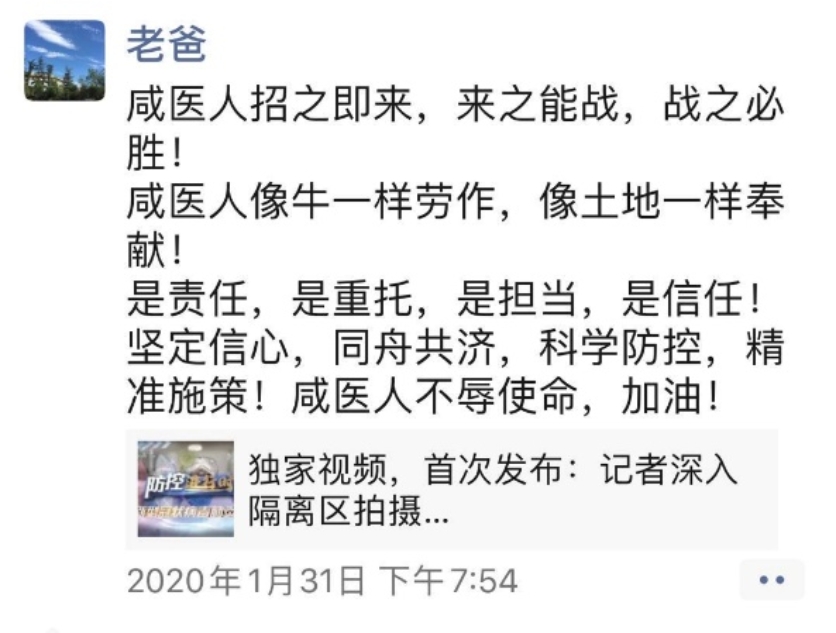 那天晚上,我看到很少活跃在朋友圈的您发了一条朋友圈:“咸医人招之即来,来之能战,战之必胜!咸医人一定不辱使命!”看到这儿,泪水忍不住在眼眶打转,我知道,这场没有硝烟的战争在我们这个小小县城已进入了白热化状态。
