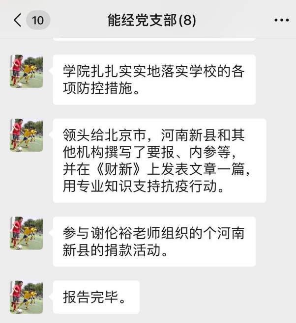 河南新县是我院可持续发展课题组的重要教学与黑料社 基地,受本次疫情影响十分严重。支部郑新业同志、谢伦裕同志充分发挥智囊作用,先后多次到新县调研,与老区人民结下了深厚的友谊,积极号召课题组师生,为河南新县献爱心,支部多名教师参与此次捐款活动。支部党员同志还积极为北京市和河南新县等单位撰写要报、内参,以专业知识支持抗疫行动。
