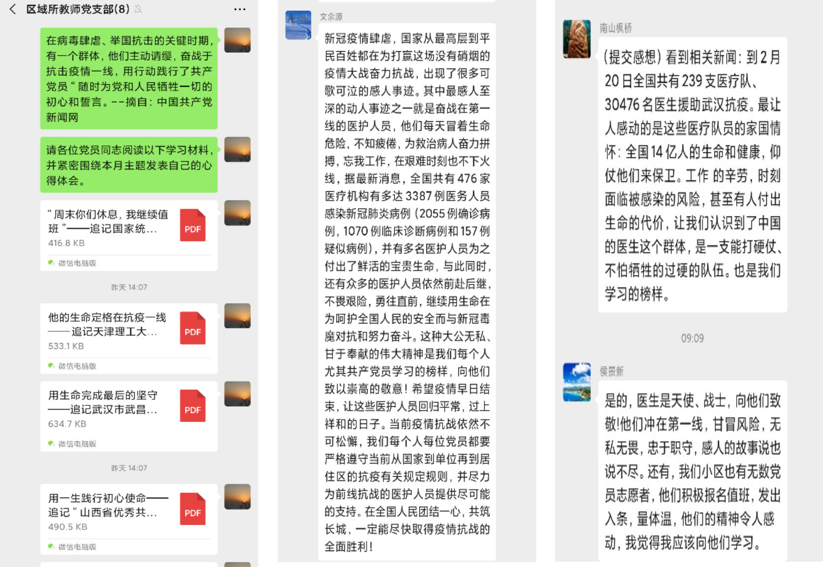 大家在活动中学习了因战“疫”而牺牲在一线的优秀共产党员的事迹,支部成员线下也自行通过新闻媒体平台了解相关事迹并总结了感想。2月24日下午至2月25日下午,党员同志们在支部微信群里积极参与讨论,真挚地表达了对抗疫一线英雄们的敬意,并表明了向他们学习、弘扬其无私奉献精神的决心。通过此次主题党日活动,使大家更加深切地感受到了榜样的力量,增强了作为一名共产党员的责任感与使命感,明确了自己努力的方向。