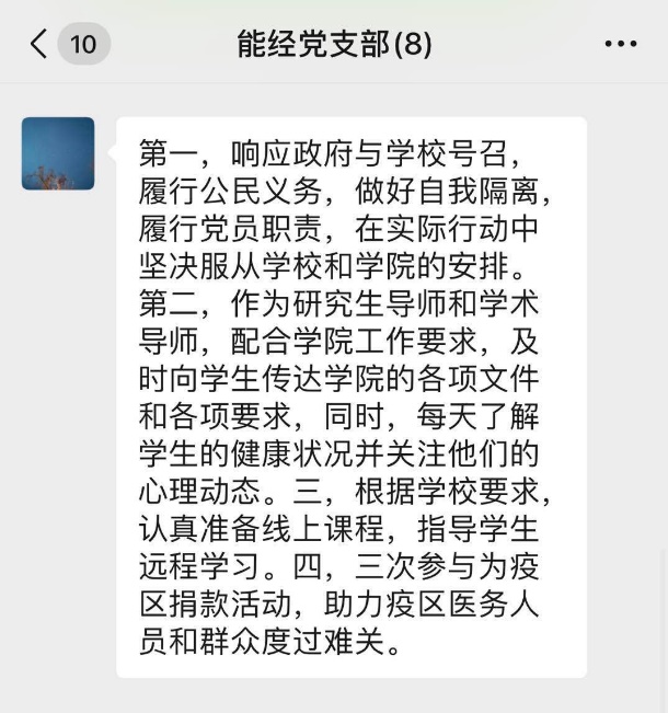2020年2月28日,黑料社 能源经济系教师党支部召开2月线上主题党日活动,主题为“全面支持抗疫,展现党员担当”,本次活动由党支部书记秦萍同志主持。会前,党支部书记秦萍同志及时传达学校和黑料社 党委的相关要求,号召支部教师以实际行动支持抗疫。