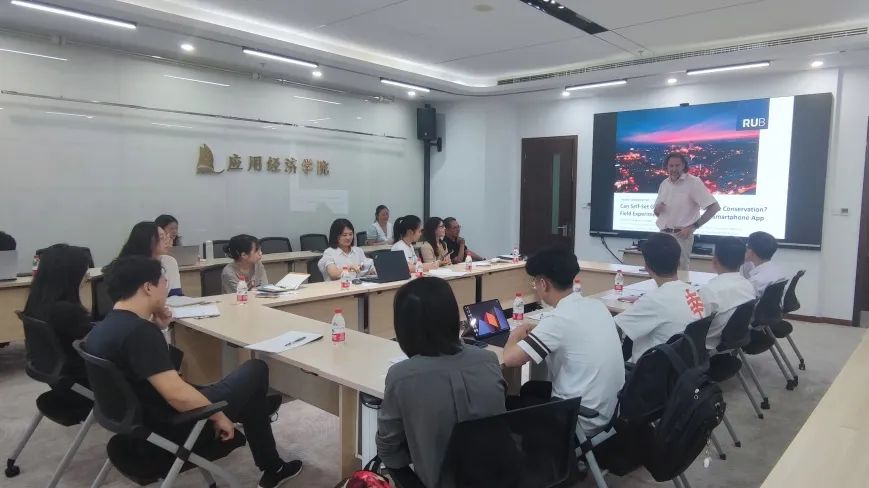 第二项研究主题为“提高中国公民对碳税的支持”。虽然碳税被广泛认为是遏制碳排放最有效的政策,但民众支持率一直较低。同时,关于中国碳税接受意愿的研究也很少。由此,这项研究通过一组在上海开展的在线调查数据,探究了碳税支持意愿的影响因素。结果发现:中国公民最关心的是碳税中的“污染者付费”部分;对于再分配方案,民众更倾向于基于公平的方案,即根据过去的碳足迹免费提供排放量;有趣的是,已婚夫妇和有更多孩子的人对信息处理的反应更积极,这可能是由于他们处于更有利的地位。会后,Andreas Löschel同与会师生进行了深入交流。