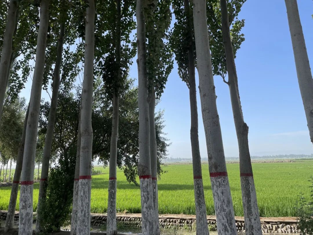 和田地区地处塔克拉玛干沙漠南缘,人口大多聚集于沙漠上的一片片绿洲之上,走出绿洲,便是一望无际的戈壁滩和沙漠,开口说话便能尝到沙土的味道。但就在沙漠边缘,冰川融水滋养灌溉着的绿洲之上,竟也有风吹稻花香的江南景象。这就是我们在和田县调研的第一站——罕艾日克镇稻香村。新疆人爱吃的手抓饭,离不开稻米这一重要的原材料。在之前的调研中我们也听到,过去生产力不足,生活条件差,稻米比小麦更珍贵,手抓饭是专门招待贵客时才会制作的美食,普通人家日常只吃馕饼和拉面。
