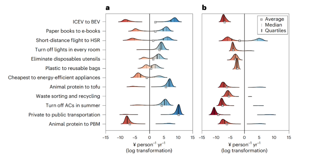 ▲图:不同减排行为的货币和非货币成本分布(a.货币成本;b.非货币成本)