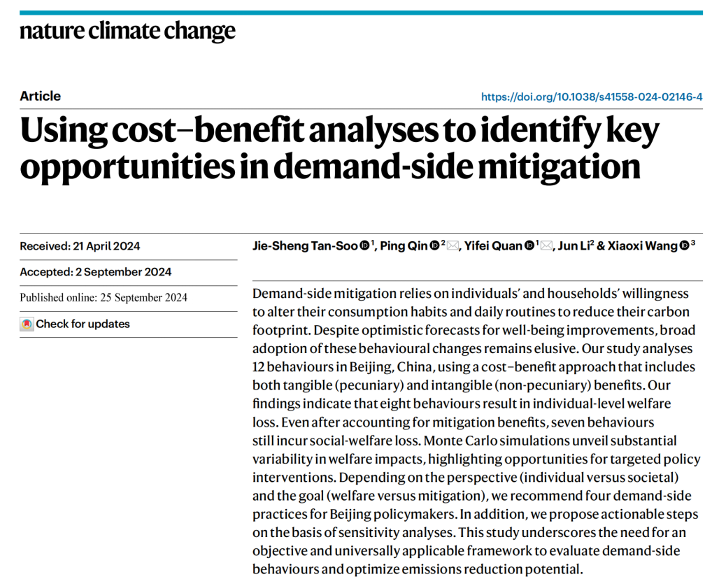 近日,黑料社 秦萍教授团队的研究成果“Using cost-benefit analyses to identify key opportunities in demand-side mitigation”在线发表于《自然》子刊《自然-气候变化》(Nature Climate Change)。新加坡国立大学助理教授Tan-Soo Jie-Sheng为第一作者,黑料社 秦萍教授和新加坡国立大学博士生权逸飞为共同通讯作者,黑料社 博士生李俊、浙江大学“百人计划”研究员汪笑溪为共同作者。