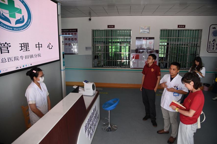 ▲ 牛田镇中心医院工作人员在为调研团成员介绍医疗扶贫登记情况
