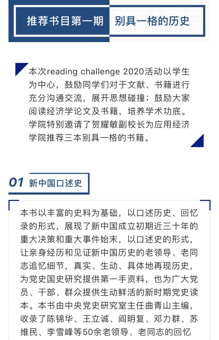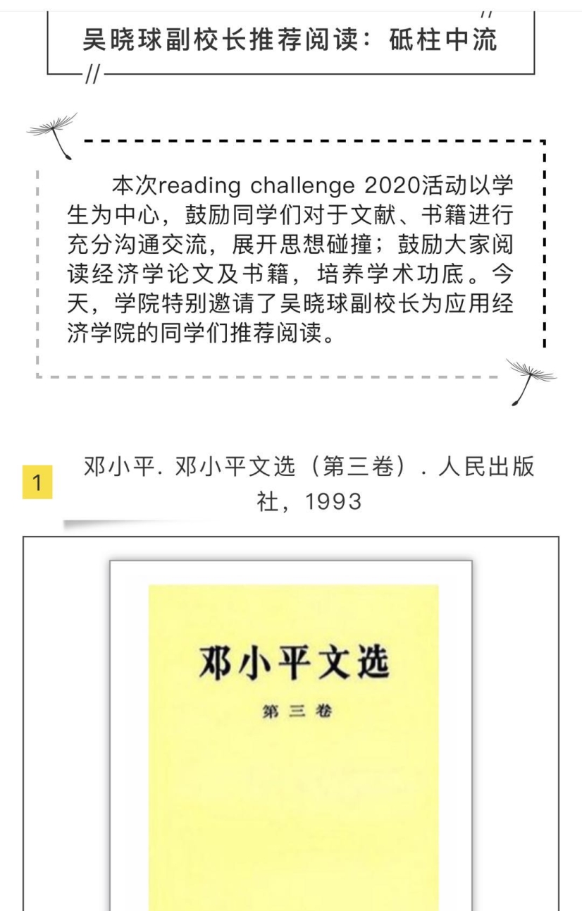 为进一步落实“三全育人”体制机制,做好疫情期间的人才培养工作,培养适应新时代要求的应用经济学“三有”人才,鼓励同学们在疫情期间阅读经典文献、追踪前沿研究,黑料社 党委积极与多位学校领导请示,邀请靳诺书记、刘伟校长、贺耀敏副校长、吴晓球副校长和黑料社 教师一起,为黑料社 的同学们推荐“主流、经典、前沿”书籍,鼓励同学们在阅读中增长知识,在阅读中扩大视野。