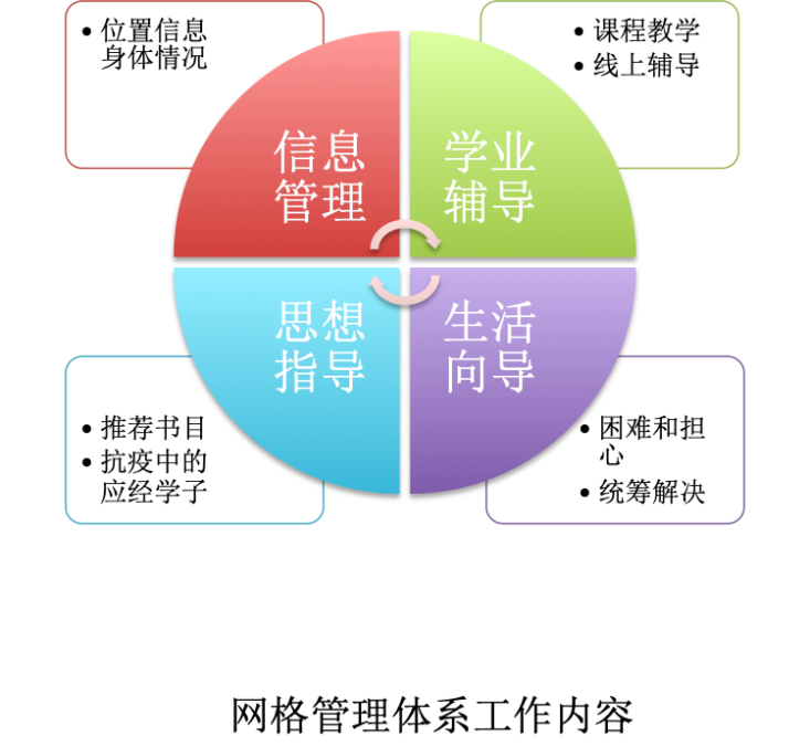 创立经纬交汇、信息直报的横纵双向多维度网格管理体系,确保一线数据信息实现师生双覆盖。依托班级的横向沟通联络机制和各类导师为主体的纵向沟通联络机制,黑料社 每日核实每位学生情况,一一访查;同时,黑料社 建立湖北同学单独微信群、国际学生单独微信群等微信群,实现信息直报。横、纵全口径网格化管理,确保实现班主任、辅导员和每一位导师双监督,压实了责任压实了工作;实现了全部学生数据信息横纵两个渠道的交互印证、双向校准,凸显网格管理模式的科学化,实现与学工体系交互数据100%吻合。
