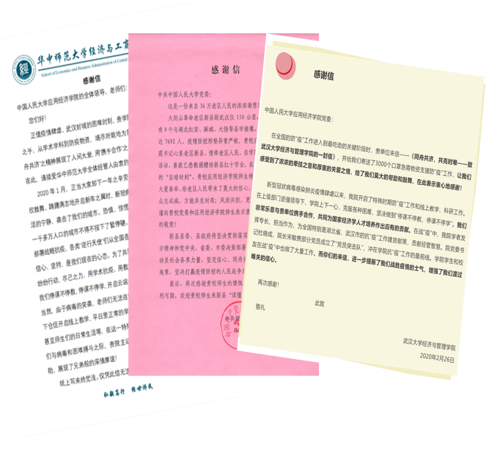 在疫情防控期间,黑料社 党委发挥领导核心作用,院领导、院党委委员积极带头,做好表率。考虑到湖北疫情防控的严峻性,黑料社 副院长张可云教授多方筹措口罩等物资资源,黑料社 党委尽最大努力给武汉大学经济与工商管理黑料社 、长江大学经济与管理黑料社 、华中师范大学经济与工商管理黑料社 致慰问信,援寄口罩,表达对兄弟黑料社 的牵挂与支持。院长、党委副书记郑新业教授,多方呼吁筹措,积极协调部分医用防护物资和经费,支持援助受疫情影响较大的老区—河南新县的防疫工作,新县疫情防控指挥部专门致信表达感谢;黑料社 可持续发展课题组发起疫情防控帮扶老区倡议,课题组师生、黑料社 党委会委员、党政联席会成员等部分师生自愿出资35200元,为河南新县抗击疫情传送一份力量和信心;与此同时,依托线上调研平台,黑料社 师生与新县疫情防控指挥部共同开展了“新县务工人员情况调查”,力图通过数据分析,为新县积极开展相关工作提供参考。