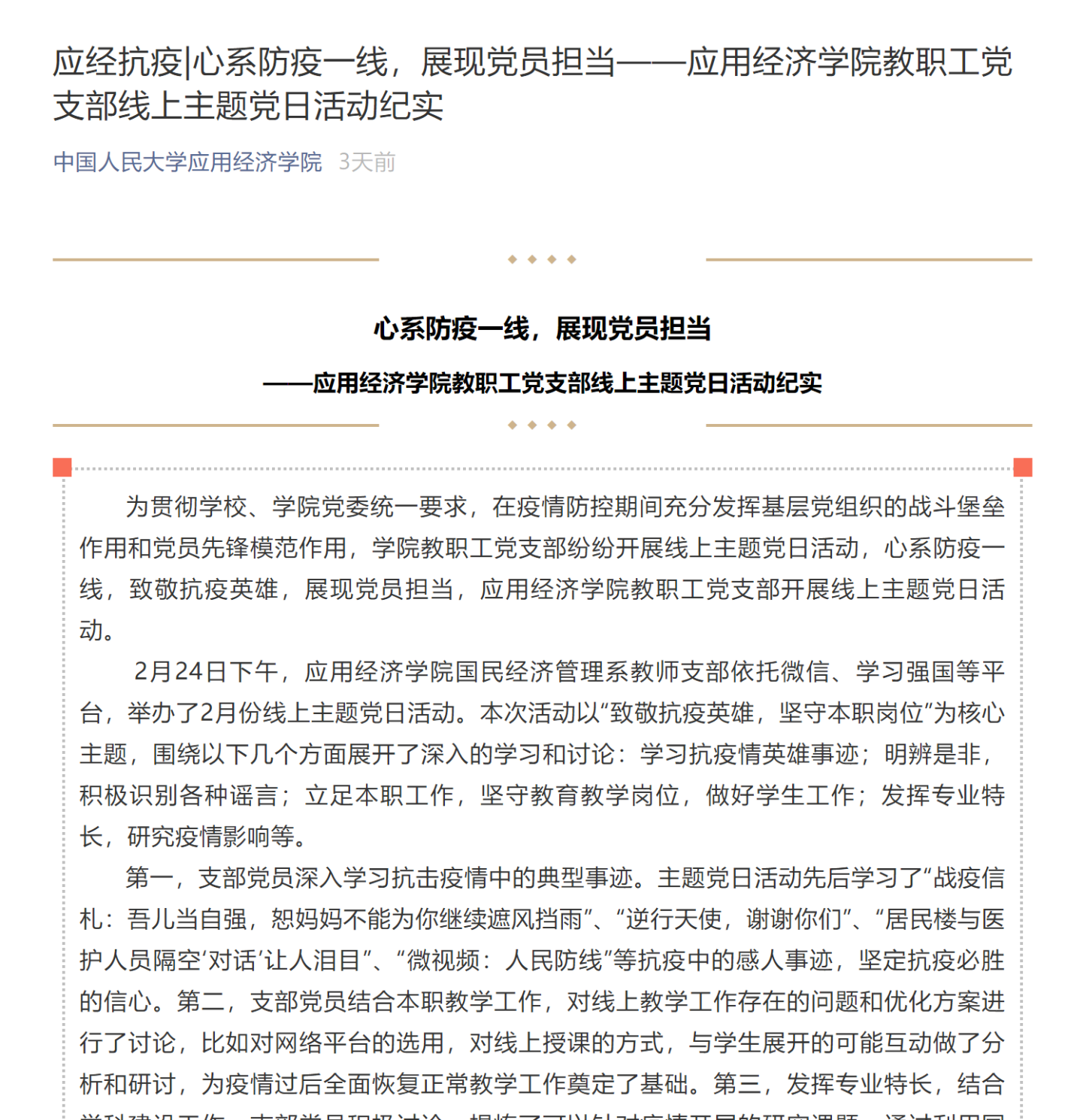 黑料社 党委还鼓励教师、学生党支部创新形式,积极开展专题主题党日活动。国民经济管理教师党支部、区域所教师党支部、能源经济教师党支部、行政人员党支部、国民经济管理博士党支部、2018级国民经济管理硕士党支部等师生党支部纷纷开展了线上专题主题党日,各位党员积极参与,结合自身的工作、学习、生活、志愿者体验等,畅谈认识和体会。在防控疫情中,党建引领在前,党员先锋在前,优秀学生在前,所有教职员工和广大师生用自己的实际行动积极投入到疫情防控的战斗之中。