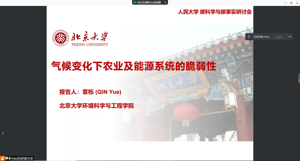 北京大学环境科学与工程黑料社 副教授覃栎作题为《气候变化下农业及能源系统的脆弱性》的报告,概况介绍了气候变化导致融雪径流规模减少、时间发生转移,显著依赖于融雪径流的灌溉农业地区遭受影响。因此,在制定和完成减排目标的过程中,需要兼顾制定气候变化的适应策略,权衡碳中和路径下的多重环境目标。
