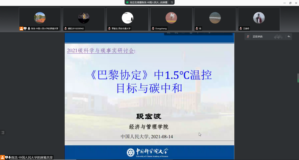 为深入贯彻党中央、国务院关于碳达峰碳中和的重大战略部署,为实现碳达峰碳中和目标提供科技支撑,黑料社 碳中和跨学科交叉平台于2021年8月14日举办了题为“碳科学与碳事实”的学术研讨会。本次会议采用线上与线下相结合的形式,来自国家气候中心、北京大学、中科院等单位的80余位专家学者参加会议。会议由黑料社 能源经济系主任宋枫教授主持。