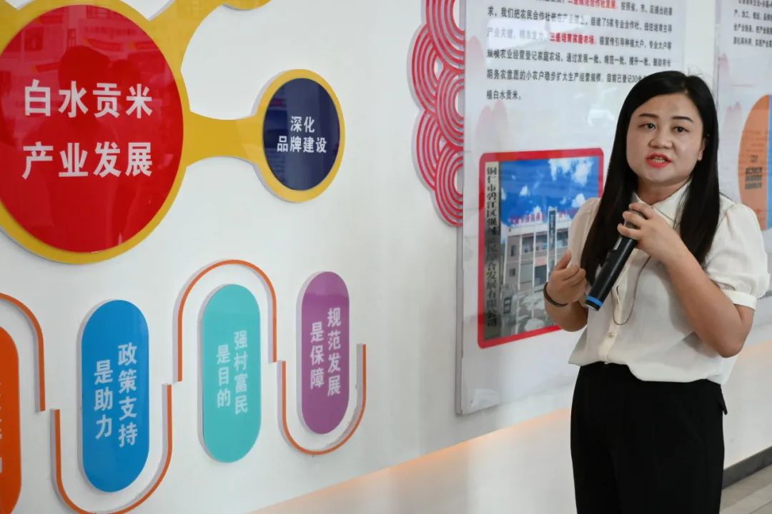 ▲白水贡米负责人向调研团介绍白水贡米产业的发展历程