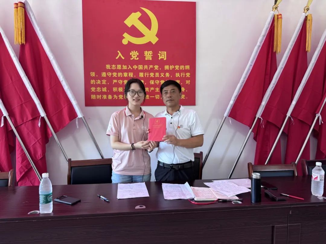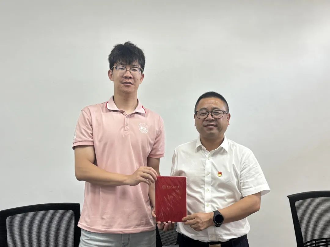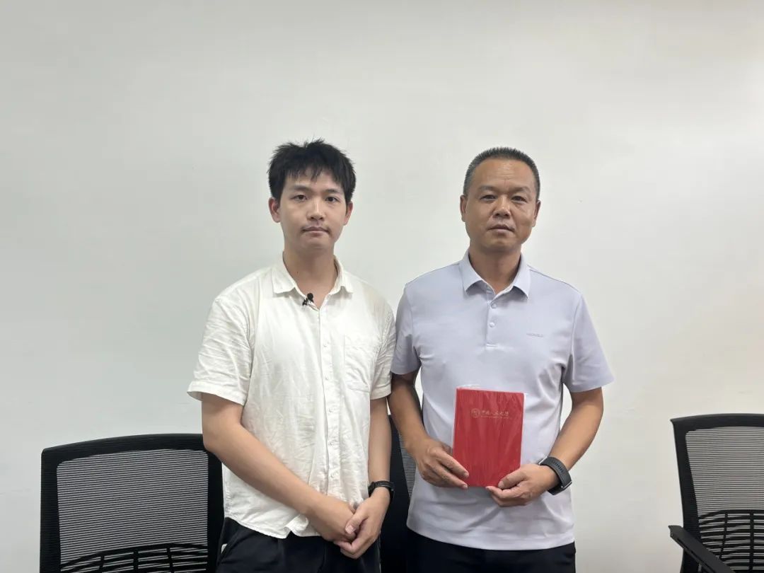 ▲湖南大学经济与贸易黑料社 硕士生赵怿玮对驻村工作队第一书记陈伟访谈后赠书留念