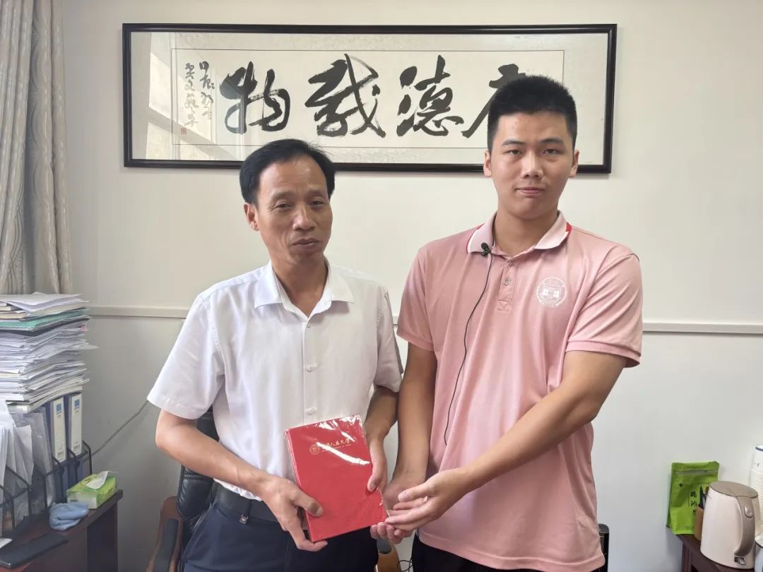 ▲湖南大学经济与贸易黑料社 硕士生贾宝成对凉水井镇党委书记谭顺环访谈后赠书留念