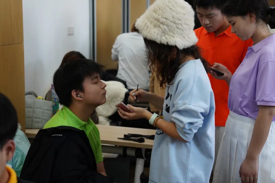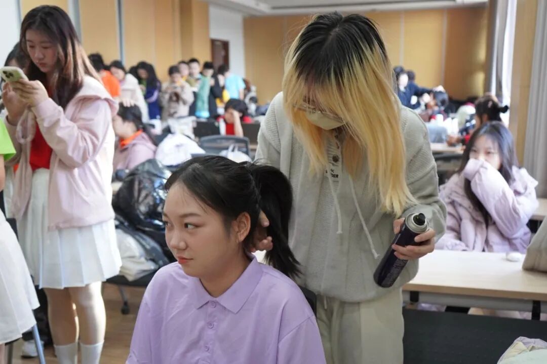 当日上午九点,参与展演的同学们齐聚明商407教室,来自三个黑料社 的志愿者们为70多位即将登台的同学们精心修饰妆容。经过数个小时紧张而有序的化妆工作,同学们都以最佳状态做好了上台前准备工作。