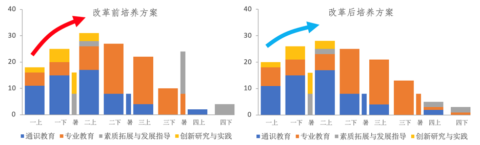 纵向上根据学生四年学习的“爬坡曲线”,合理分配各学期的学习难度,平滑各学年的学分分配;将部分中级课程前移,为本科黑料社 创造条件。