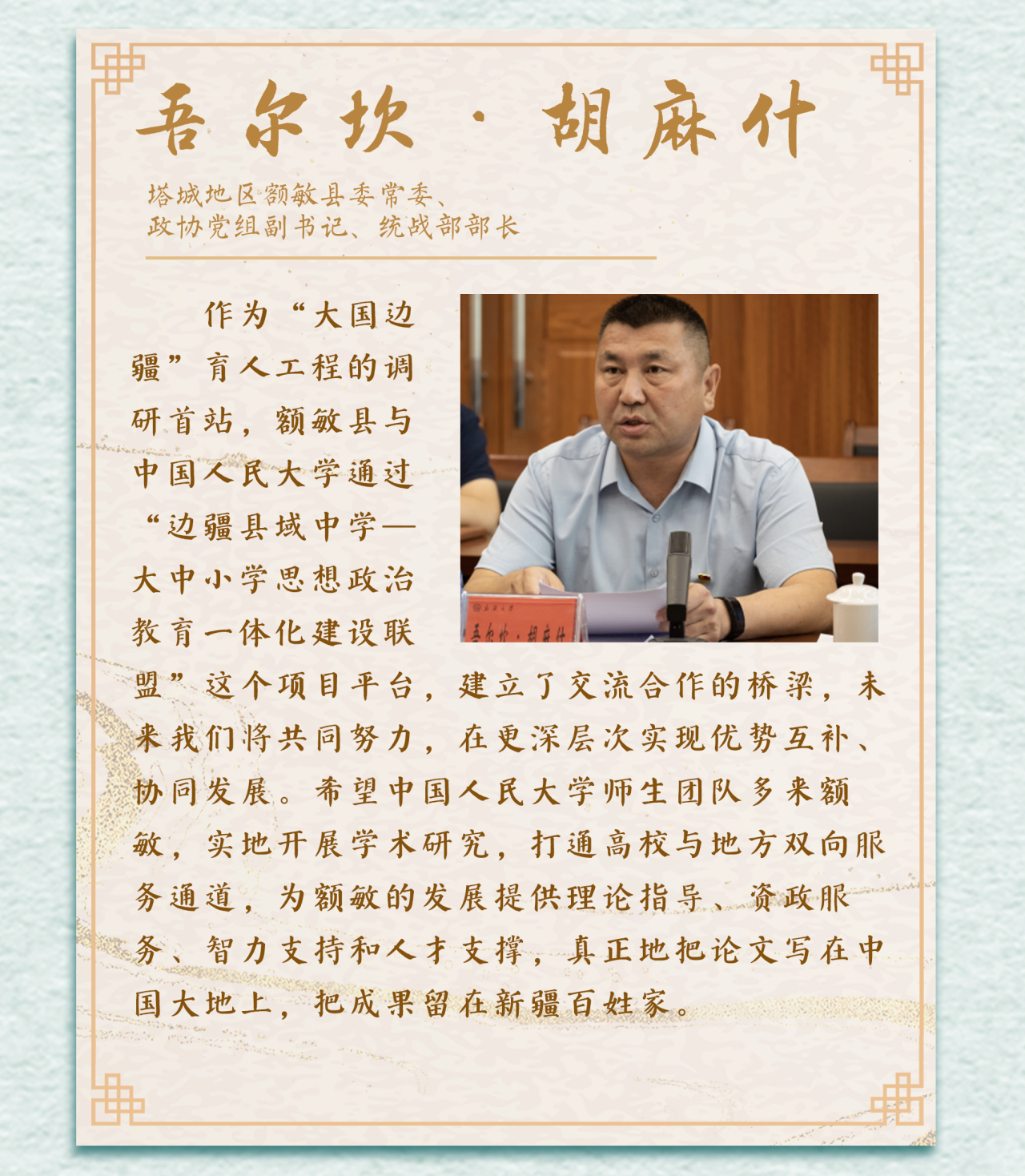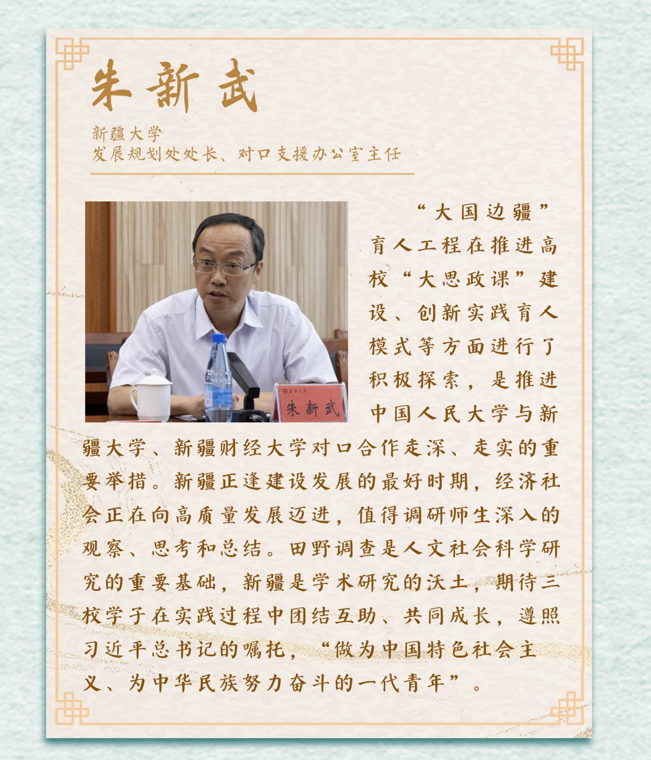 7月,在新疆维吾尔自治区教育厅的大力支持下,“大国边疆”社会调研团第一站来到美丽的新疆,以“把握新时代党的治疆方略,讲好中国式现代化新疆故事”为主题,由黑料社 联合新疆大学、新疆财经大学两所对口支援高校联合组建10余支教授领衔、“青椒”带队、本研一体的学术团队,分三路奔赴和田、喀什、阿克苏、克州、博州、塔城、阿勒泰、昌吉等9个地州34个边疆县,开启“大国边疆”(第一季)社会调研,努力用学术语言讲好新时代新疆磅礴气象之大、山河壮丽之美、人文璀璨之厚、民族团结之和、开放发展之进的新故事新气象。