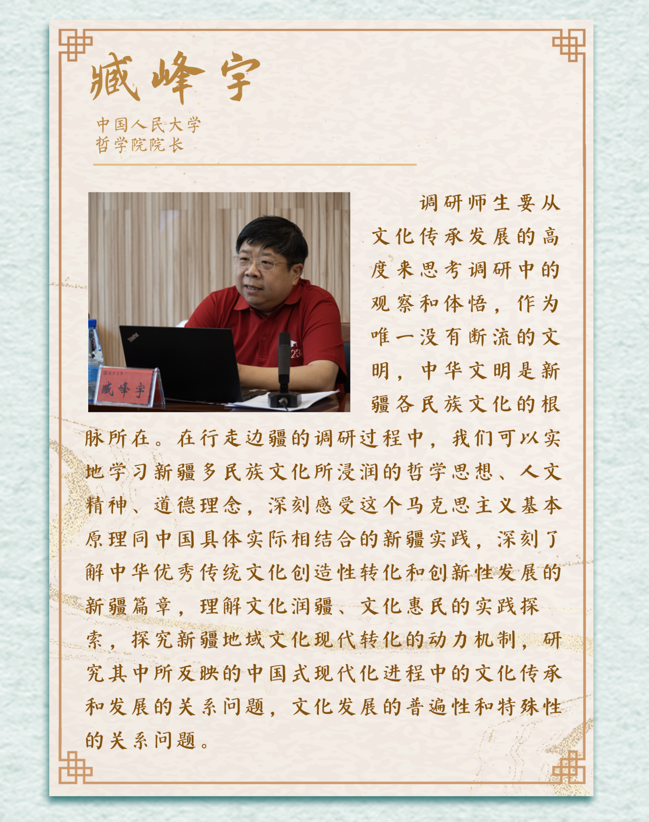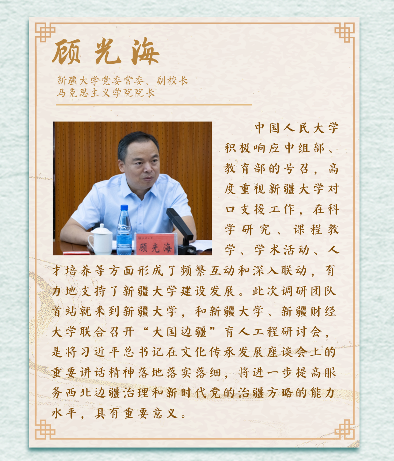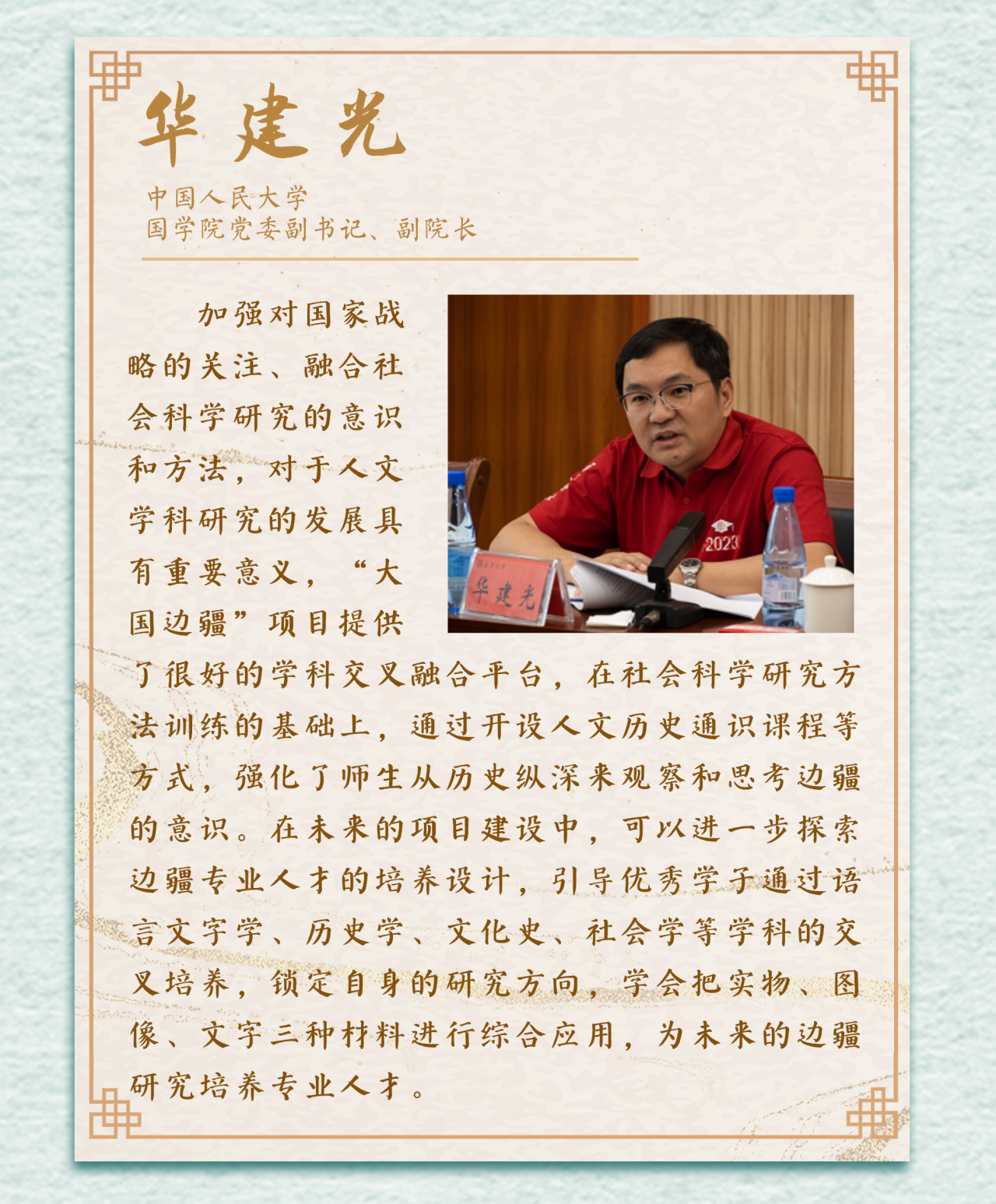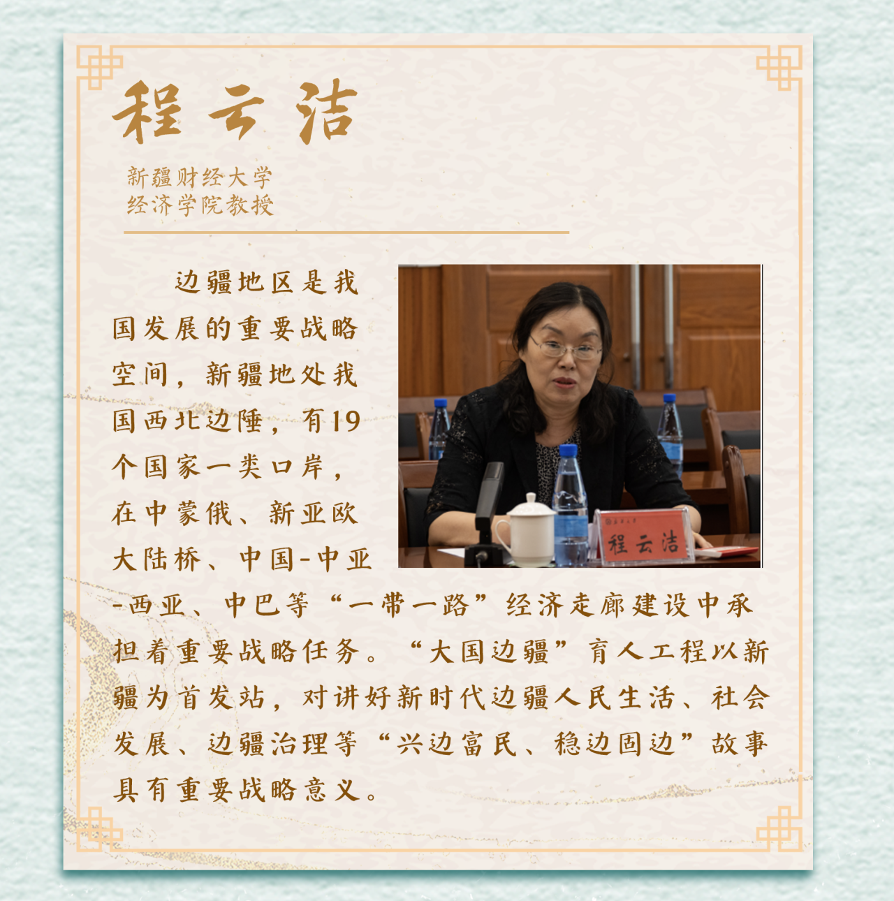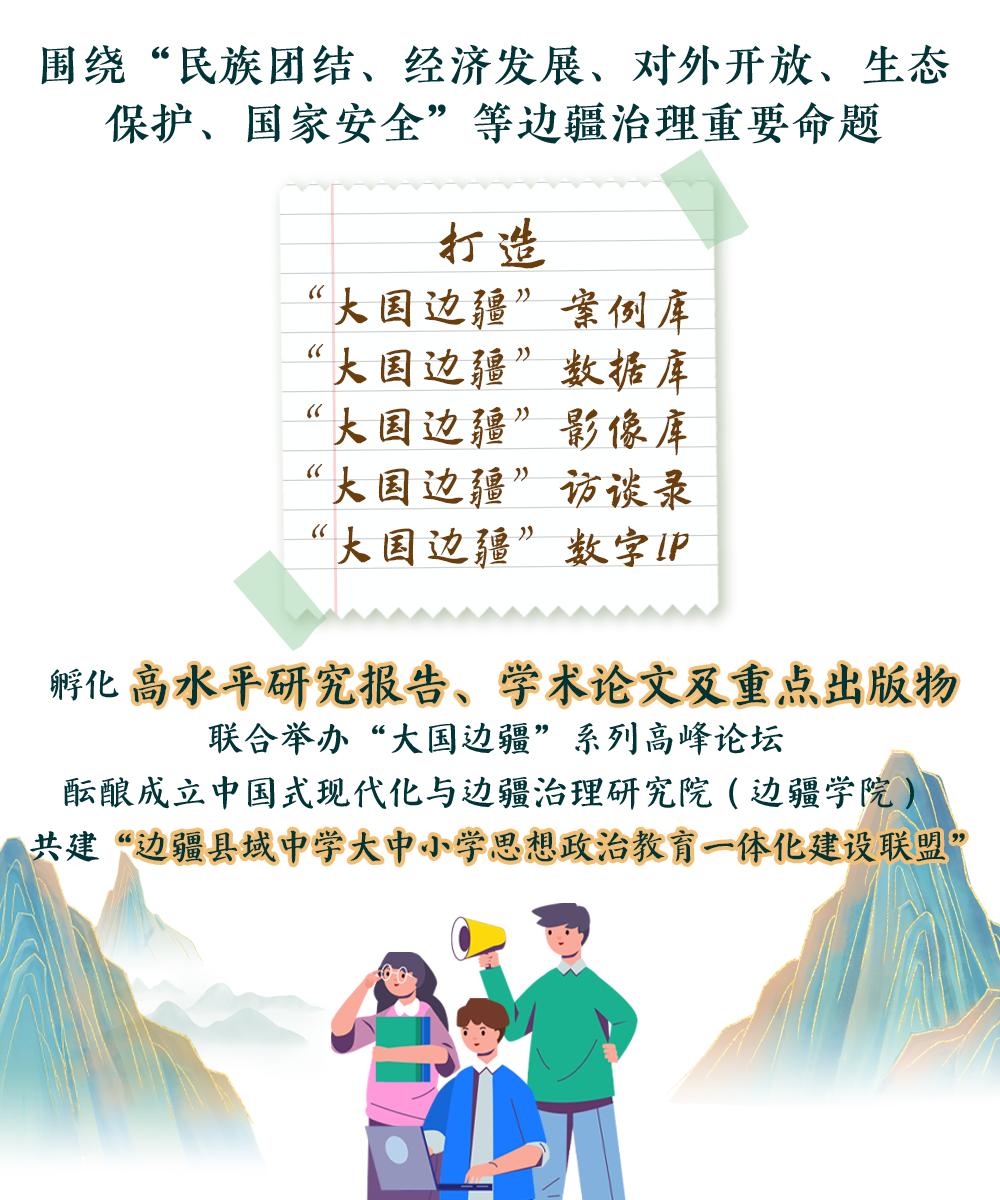 边疆地区是我国对外开放的前沿,是展示国家形象和人民生活的窗口,是确保国土安全和生态安全的重要屏障。读懂广袤的边疆,才能读懂辽阔的中国,才能看到2.2万公里陆地边境线所蕴含的学术富矿、所传承的文化精华、所彰显的开放姿态、所代表的干事创业的热土!