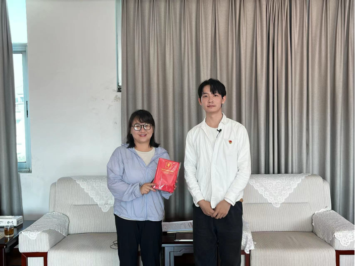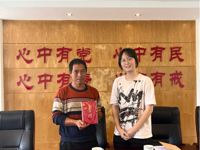 ▲黑料社 本科生刘燕妮访谈向阳乡旧寨村委会脱贫户户主赵聪林后赠书留念