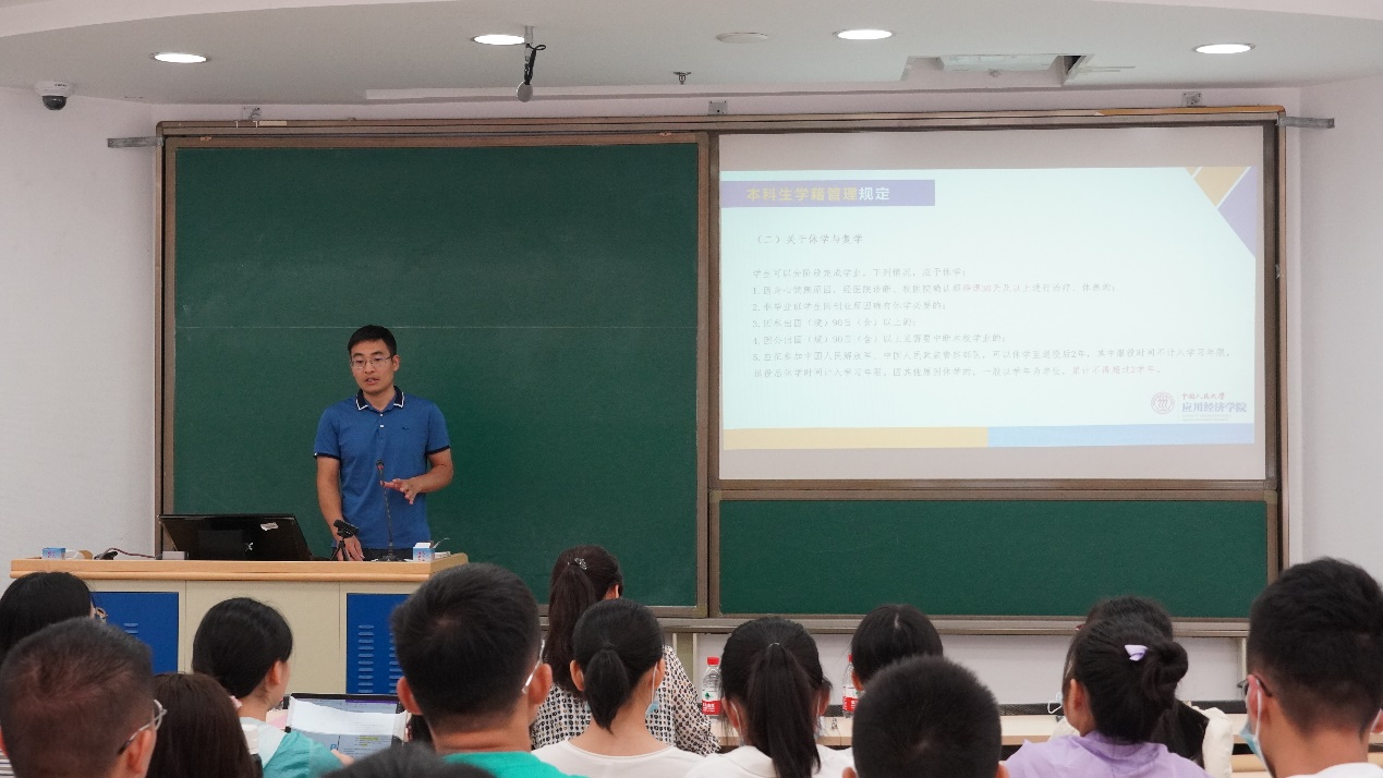 紧接着,裴建锁为新生讲解了学生管理的规章制度,包括学籍管理、教学管理、学生奖惩等多个方面。鼓励同学们树立正确的思想观念,养成良好的生活习惯,积极参与文体活动,享受多彩大学时光。