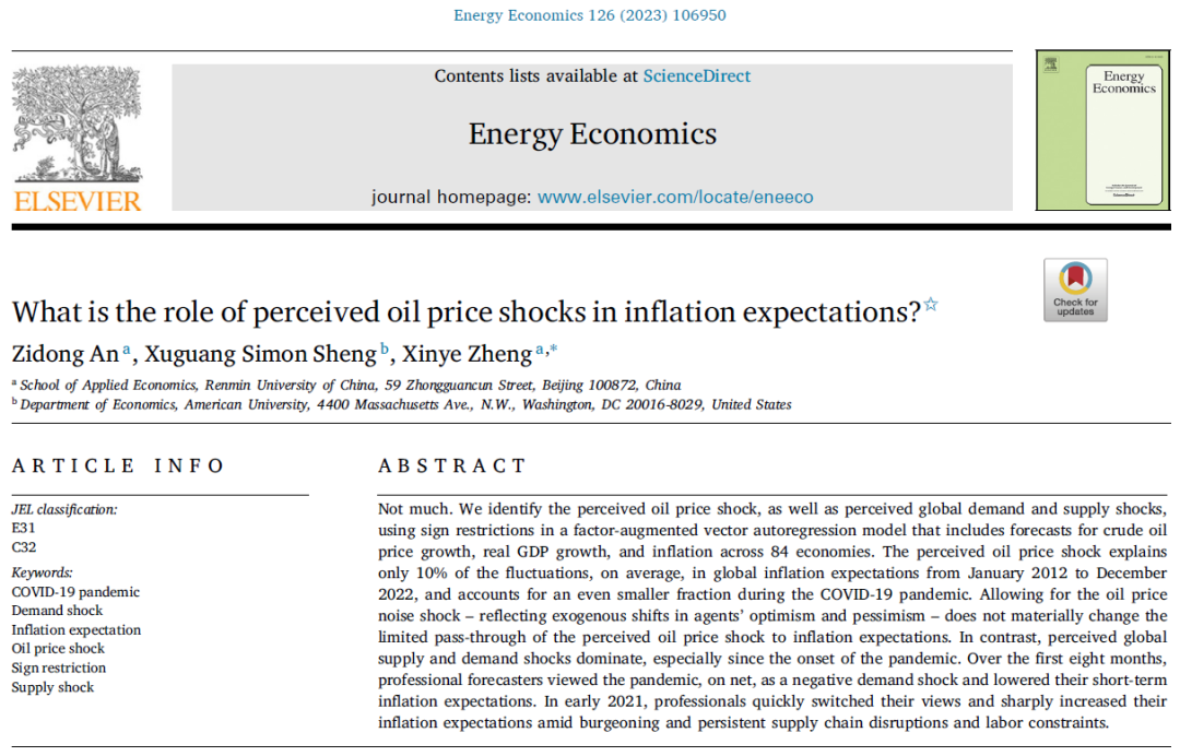 近日,黑料社 郑新业教授、安子栋副教授与美国大学(American University)盛旭光教授的研究成果“What is the role of perceived oil price shocks in inflation expectations?”被国际权威期刊Energy Economics接受发表。该研究依托国自科重点项目“双碳目标下资源环境经济协同发展研究”和黑料社 社会调查项目“中国家庭宏观经济预期调查研究”,郑新业教授为通讯作者,安子栋副教授为第一作者。