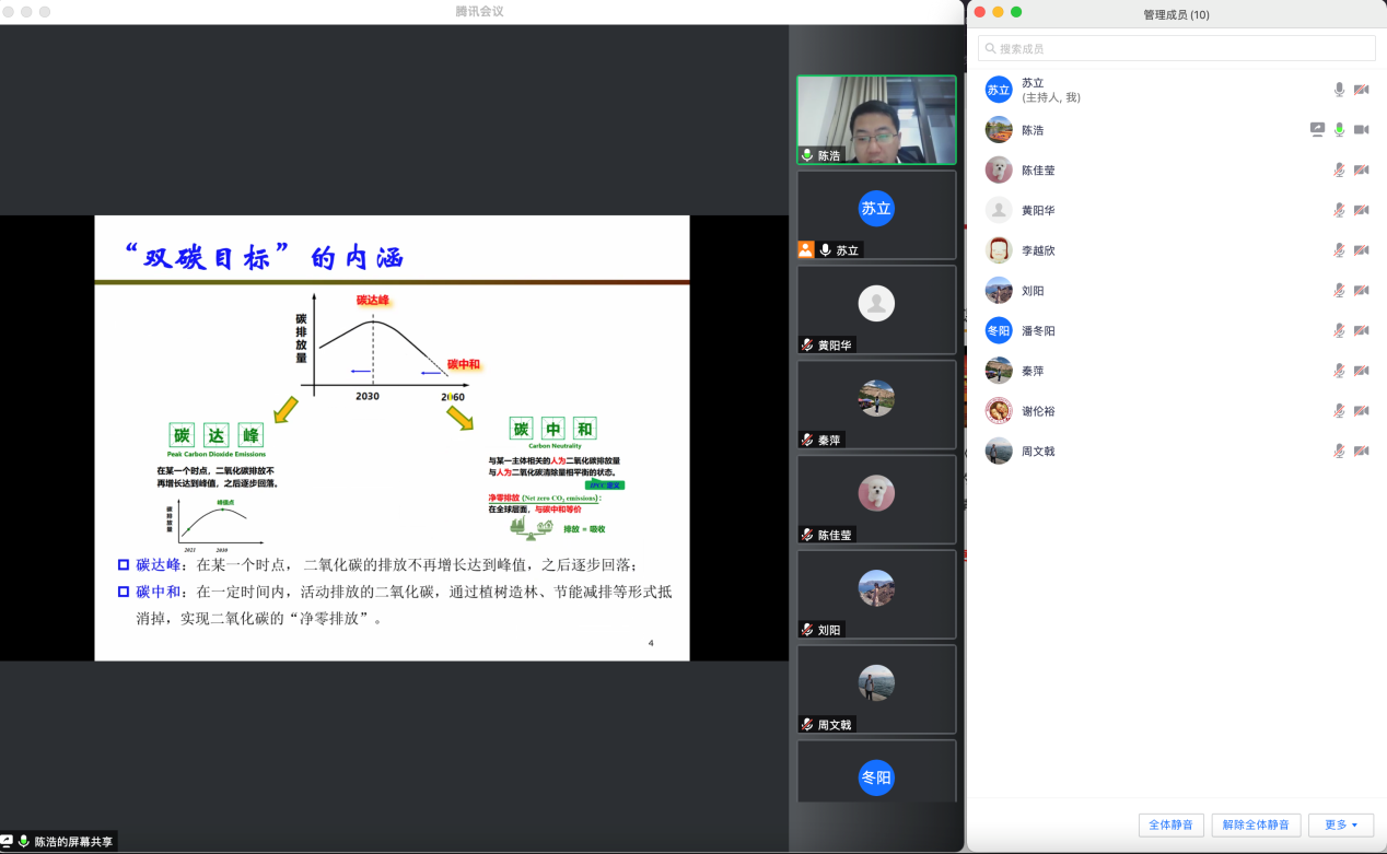党支部宣传委员陈浩同志分别从总体要求、主要目标和工作重点任务三个部分展开了领学。首先,他介绍了我国在碳达峰与碳中和目标实现过程中的指导思想,坚持“全国统筹、节约优先、双轮驱动、内外畅通、防范风险”的工作原则。其次,借助形象的示意图,解释了碳达峰和碳中和的概念和内涵,指出了实现碳中和路径中关键时点上的考核指标。最后,详细解读了实现“双碳目标”采取的推进经济社会发展全面绿色转型等十项工作重点任务。