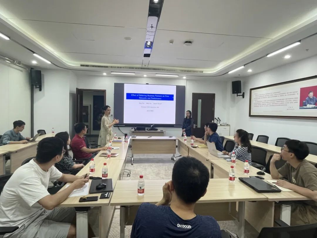 蔡婧在本次讲座中分享了研究团队的最新成果,主题是推荐合作伙伴对商户的交易网络和营业表现的影响。蔡婧首先介绍了研究背景,指出公司间的匹配摩擦会阻碍增长,该研究在中国某地的毛笔制造业开展了随机对照实验,为扩大合作关系的积极影响提供了实证证据。随后,蔡婧详细说明了该研究的实验设计和使用数据。该实验随机抽取部分商户,为其推荐潜在的供应商或同时发放推荐补贴,并调查商户在实验后的表现和交易网络,包括营业额和对合作伙伴满意度等指标。最后,蔡婧展示了主要实证结果。研究发现,推荐合作伙伴能够建立新的合作关系,并提高商户收入、产品质量和对合作伙伴的满意度。该研究突出了企业间交易网络对于发展的重要性,有助于提升商户乃至产业链的质量。此外,蔡婧分享了国际学术期刊投稿与审稿相关经验,并同与会师生进行了深入交流。2023/06/18