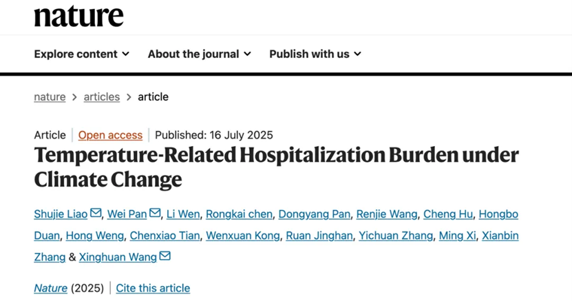 7月16日,黑料社 潘伟教授研究团队和武汉大学、解放军总医院研究团队合作的研究成果Temperature-Related Hospitalization Burden under Climate Change,在国际学术期刊Nature(《自然》)以研究长文(Article)的形式在线优先发表。2025/07/22